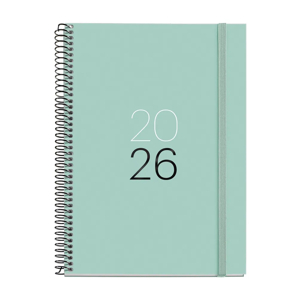Agenda Espiral Plus 2026 con formato semana a la vista horizontal, cubiertas espiraladas de cartón forrado y plastificado mate, perfecta para planificar tus actividades con comodidad y estilo.
