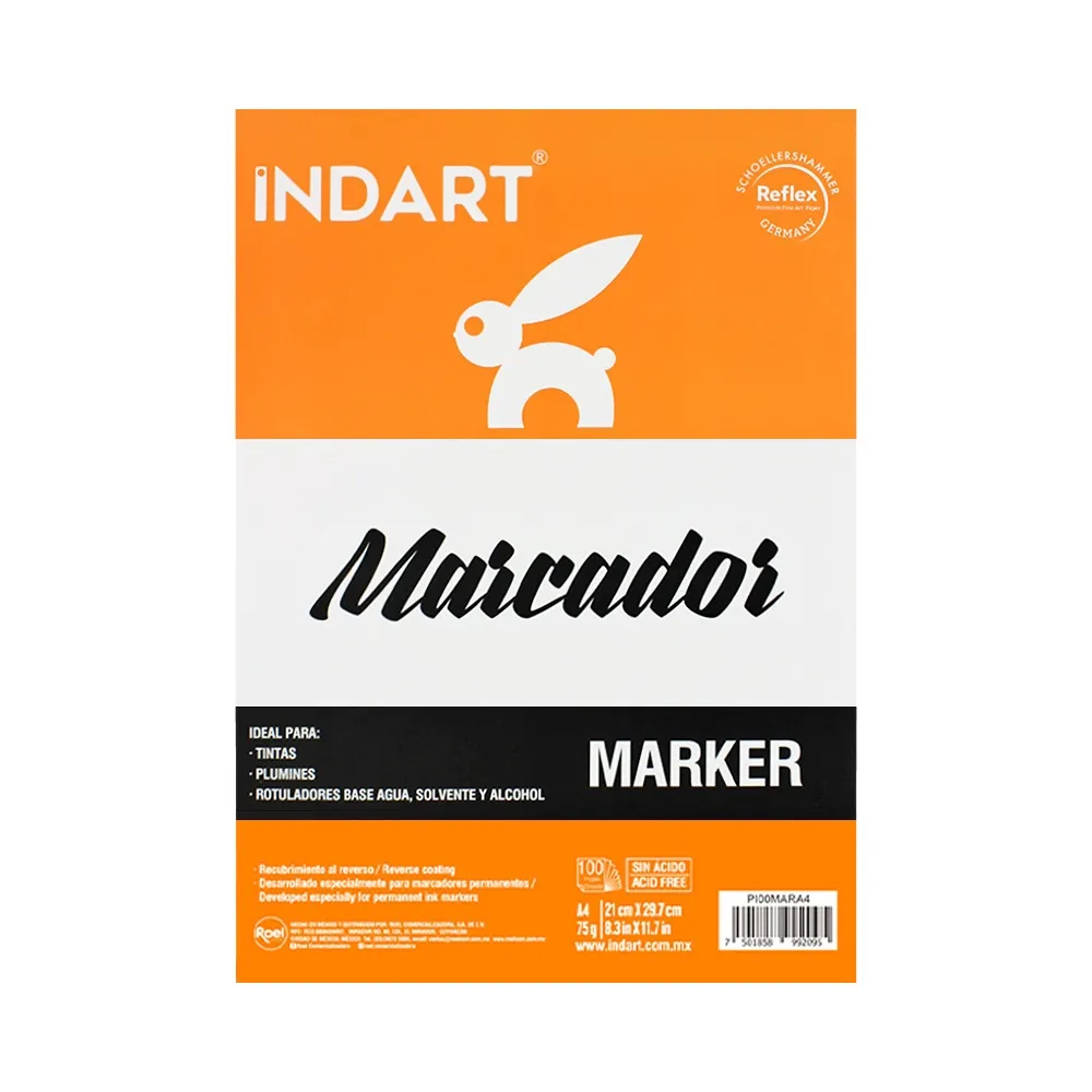 El Bloc marcador Roel Indart está constituido de papel semitransparente con superficie lisa. Cuenta con recubrimiento al reverso que evita la transmisión de la tinta y está diseñado especialmente para todo tipo de marcadores. No tiene ácido y es ideal para tintas, plumines y rotuladores a base de agua, solvente y alcohol. El papel es 100% alfa celulosa de color blanco óptico, libre de ácido y con grano completamente satinado con una barrera plástica