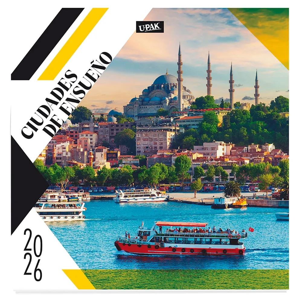 Calendario de pared 2026 Upak Ciudades de Ensueño 30.5 x 30.5 cm con papel couché de 118 g, forros de 150 g, encuadernación en grapa, barniz UV brillante, diseño colorido y de calidad ideal para organizar tu año con estilo y practicidad.