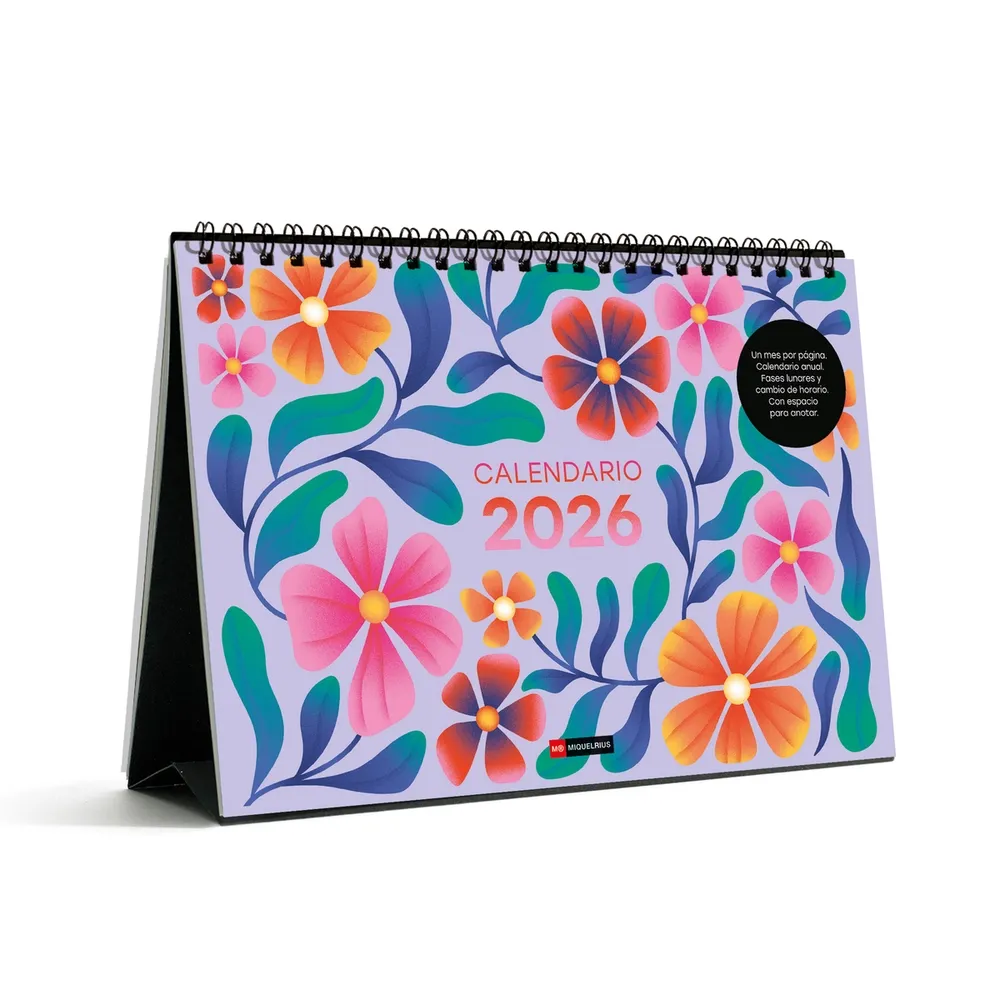Calendario de sobremesa 2026 Miquel Rius Flores A5 con ilustraciones florales elegantes, espacio para notas y recordatorios diarios, numeración clara de días y semanas, formato mensual, ideal para escritorio u oficina, combina planificación eficiente con diseño decorativo y agradable.