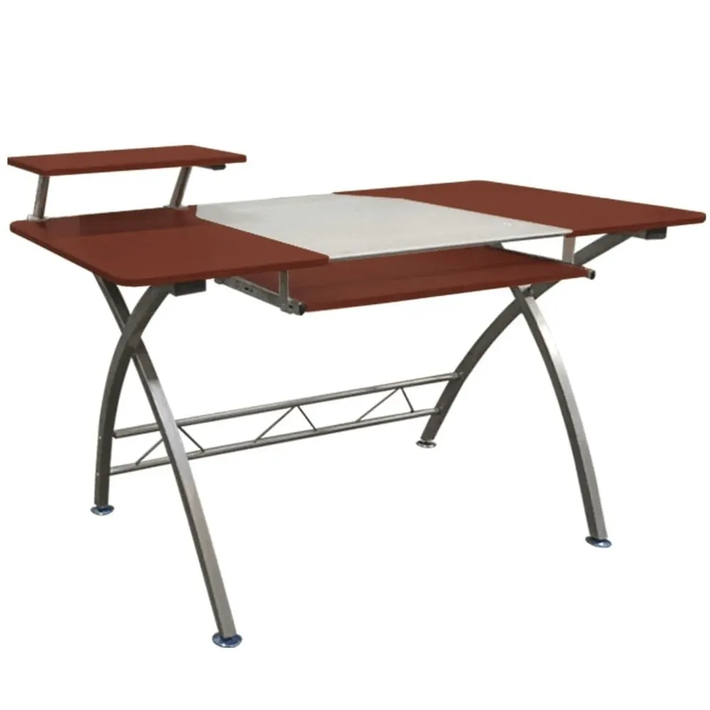 El escritorio Lirio está fabricado con estructura metálica, cubierta de MDF y vidrio templado al centro.