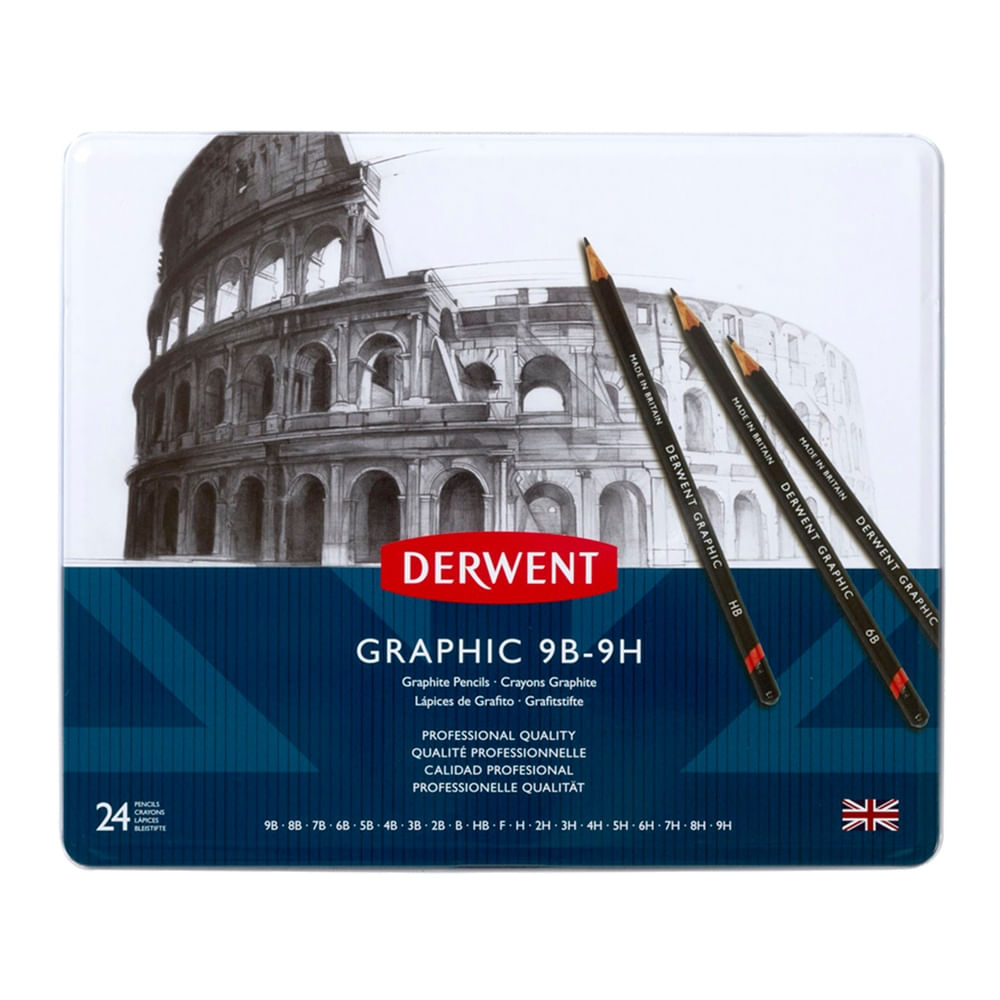 set profesional de grafito con 24 grados diferentes, desde 9H hasta 9B, ideal para sombrear, dibujar y detallar con precisión.