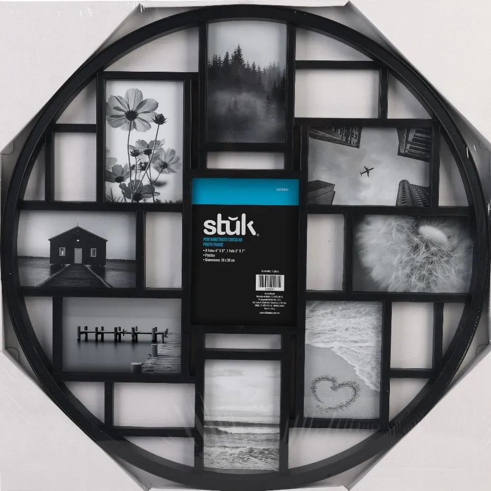 - Portarretrato circular decorativo Marco de diseño moderno con forma circular para exhibir nueve fotografías en un solo espacio, logrando una composición visual armoniosa y llamativa en cualquier pared. Su estructura resistente mantiene las imágenes seguras, mientras su estilo decorativo se integra fácilmente en salas, recámaras u oficinas.